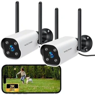 WOLFANG 2K Security Camera Outdoor 2 Pack, with Night Vision, AI Detection, IP65 Weatherproof,Siren Alarm, Way Audio, Work Alexa & Google Home, 2.4G WiFi, Cloud&SD