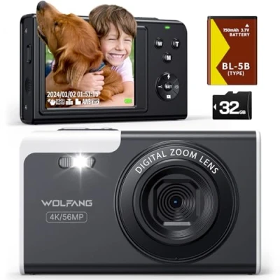 【4K digital camera for all ages】Experience the simplicity of 4K video and 56MP images, ideal for capturing life moments with family-friendly operation. This 4K digital camera is an ideal starting point for kids and teens learning to take photos, but its clear output is also suitable for adults and seniors who appreciate uncomplicated technology. 【Easy autofocus function】With user-friendly autofocus and macro function, capturing sharp images is a breeze. From school theater to backyard discovery, this compact camera adapts quickly and makes photography fun and easy for kids. The AF function is designed for beginners and guarantees clear shots every time with minimal effort. 【16x Digital Zoom & Flash】With 16x digital zoom and built-in flash, this kids camera is ready for any environment, day or night. The video pause and time-lapse functions of this compact digital camera offer creative flexibility, perfect for documenting everything from the busy streets of London to the tranquil countryside. 【Multifunctional camera】 The pocket camera supports various functions such as self-timer, face detection, continuous shooting, time-lapse recording, etc., all of which help to enhance the shooting experience. What's more, the Point-and-Shoot camera has a built-in microphone and speaker, so you can record crystal-clear sound when you shoot and play back your recordings with sound. 12+24 MONTHS WARRANTY & CUSTOMER SERVICE: WOLFANG digital cameras come with 12 months warranty and lifetime technical support. If you have any questions or need to upgrade accessories (mini tripod、card reader), please contact our customer service. We will solve the problem within 24 hours on working days. If you have any questions, please find us through our online customer service or official email: [email protected], we will solve the problem to your satisfaction as soon as possible.