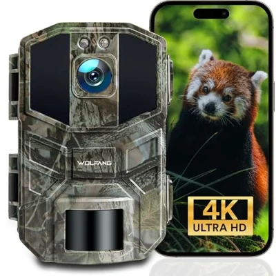 WOLFANG Wildlife Camera 64MP 4K HD, WiFi Bluetooth Trail Camera, Hunting with Night Vision Motion Activated, IP66 Waterproof, 0.1s Trigger Time for Recording、Indoor Monitoring