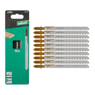 wolfcraft 10 Jigsaw Blade, Fine Cuts HCS Blade with T Shank Ideal for chipboard and softwood Cutting Depth 60mm 8015100