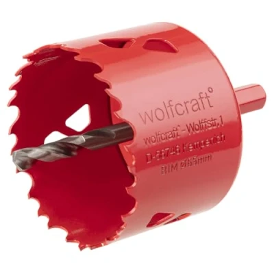 hole saw made from bi-metal for use in wood, metal, plastic, drywall materials and insulating boards (e.g. gypsum plaster board and OSB) progressive vario-toothing made from high speed steel (HSS), large discharge holes, Ø 9.5 mm hexagon shank available in various diameters, 40 mm cutting depth for a wide range of interior works and metalworking projects, Manufacturer: wolfcraft