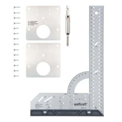For accurate repair of two pot hinges on the door side Universal mitre hook for measuring, scratching and drawing Illustrated step-by-step guide for perfect results, Manufacturer: wolfcraft