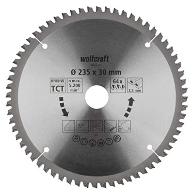 TC saw blade with trapezoid flat toothing and high number of teeth for fine, clean rip and cross cuts through wood, wood with nails, plastics, thin steel profiles, non-ferrous metals long service life and quiet running, minimal noise, tear-free cutting edges, Manufacturer: WOLFCRAFT