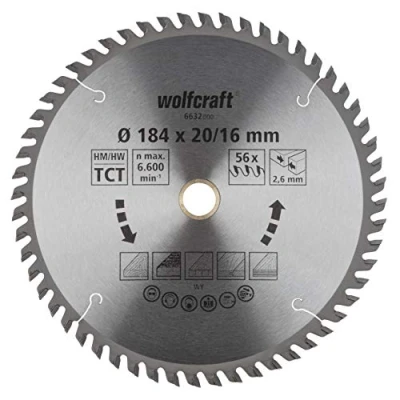 alternate tooth TC saw blade with high number of teeth for fine, clean rip and cross cuts through natural woods, fibre boards, profiled boards and panels long service life and low-noise working as well as firm, tear-free cutting edges, Manufacturer: WOLFCRAFT