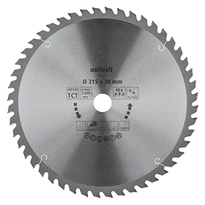 TC saw blade with alternate toothing and high number of teeth for fine, clean rip and cross cuts through solid woods, chipboards, plywood, fibre boards, profiled boards and panels long service life and low-noise working as well as firm, tear-free cutting edges, Manufacturer: wolfcraft