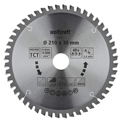 diamond-polished TC saw blade with alternate toothing and negative rake high number of teeth for fine, clean rip and cross cuts through solid woods, chipboards, plywood, wood core chipboards, fibre boards, profiled boards and panels long service life, safety and low-noise working as well as firm, tear-free cutting edges, Manufacturer: WOLFCRAFT