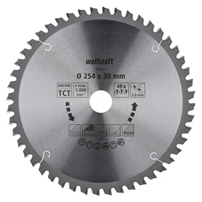 diamond-polished TC saw blade with alternate toothing and negative rake high number of teeth for fine, clean rip and cross cuts through solid woods, chipboards, plywood, wood core chipboards, fibre boards, profiled boards and panels long service life, safety and low-noise working as well as firm, tear-free cutting edges, Manufacturer: WOLFCRAFT