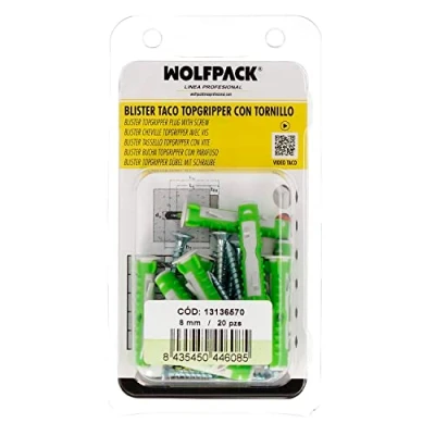 Plug measure: Ø 8 mm. Screw size: Ø 5 x 50 mm. Block made of multi-expansion Bimaterial suitable for all types of material, (Stone / Concrete / Solid Brick / Semi-solid Brick / Hollow Brick / Hollow Concrete Block / Plasterboard / Plasterboard / Plasterboard) Thanks to the union of 2 materials and the exclusive design we obtain security for perfect installation, high load values and use a plug for all your projects. Anti-torsion fins so that the dowel once inside the hole does not rotate, both on the head and on the body. 4 expansion sectors, to fit all building materials, massive, semi-solid or perforated. Increased non-slip collar. Perfect screw centering., Weight: 76.0 grams, Manufacturer: WOLFPACK LINEA PROFESIONAL