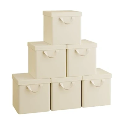 WOLTU Fabric Storage Boxes Set of 6, Folding Baskets with Lids, Handles, Metal Frame, Wardrobe Toy Organisers for Bedroom, Office, Living Room, Cream, 27x27x27cm