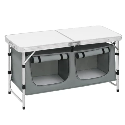 STURDY CONSTRUCTION: Constructed of aluminum alloy with solid MDF tabletop which can hold up to 66lbs of evenly distributed weight, the camping table is robust and stable. The 600D oxford fabric carton underneath the tabletop can hold up to 33lbs The horizontal structure of the product is made of FSC- wood. HEIGHT ADJUSTABLE: Its 2-level height setting on the portable table makes it versatile. It is easy to be adjusted by pressing the push button. 62 and 69.5cm heights are available, and each side can be adjusted independently to stay stable on different ground. The picnic table legs are equipped with non-slip caps to reinforce the stability and protect your floor from scratching when used indoors AMPLE STORAGE CAPACITY: The camping table is ideal for camping with several friends because it has an oxford fabric carton with zippered doors, providing ample storage rooms for food and essentials and protecting the food from dirt and animals. There is also a large table top (L120X W47cm) for displaying the essentials for outdoor activities EASY TO CARRY and STORE: It is a camping table that can be taken anywhere because it only occupies 60x47x10cm like a briefcase after being folded. Thanks to its compact design after folding and regular shape, it is easy to fit in the boot of your car. It is such a big helper for the camping trip with your friends and family INDOOR & OUTDOOR FOLDING TABLE: The multipurpose table is suitable for indoor and outdoor activities. Whether for camping, picnics or fishing, garden parties, campus club activities or bazaar, exhibitions, the light weight folding table offers you great convenience thanks to its portability. It is also great to be used as a home office table or an extra table for larger space The horizontal structure of the product is made of FSC-certified wood.