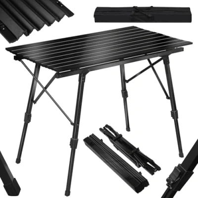 STURDY & STABLE CAMPING TABLE: Constructed of aluminum alloy with crossed bars which can hold up to 110lbs weight when evenly distributed. Each foot are protected with a anti-slip cover in plastic, so that the table can last years and work stably OUTDOOR & INDOOR USE FOLDINIG TABLE: The folding camp table is made of sturdy aluminum, and it resists water, rust, scratches, and is super easy to clean and maintain. It is ideal for outdoor use. You can also use it indoors singly for a small group or line them up end to end to create a long buffet style table EASY TRANSPORT AND STORAGE: Its lightweight and compact design makes it super easy to move around by anybody and quick storage when not in use. You can roll up the table top and fold other parts into a compact size L19.5x W14x H94cm and put the table into the oxford bag with handles. The weight is only 3.84kg ADJUSTABLE HEIGHT AND LEGS: This portable roll-up table is easy to set up. You just need to fully extend the legs and tabletop base and then buckle the tabletop up and then adjust the legs to a suitable height. The height of the table can be adjusted between 45-69cm and each leg can be adjusted independently to suit different ground WIDELY APPLICATION: This lightweight picnic table is ideal for both indoor and outdoor use. They will make your life easier in camping, picnics, barbecues, backyard parties or even the campus club activities or the flea market. With a roll-up tabletop work surface, storing and displaying fruits, snacks, dishes on this camping table will be a breeze
