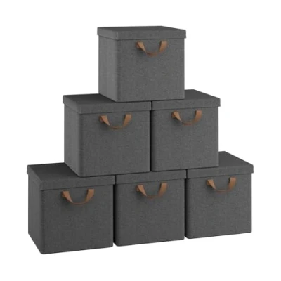 WOLTU Set of 6 Fabric Storage Boxes with Lids, Folding Baskets Handles, Metal Support Frame, Toy Wardrobe Organisers, for Living Room Bedroom Office, 27x27x27cm, Grey
