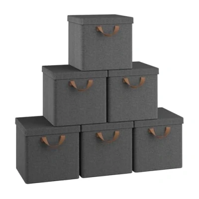 WOLTU Set of 6 Fabric Storage Boxes with Lids, Folding Baskets Handles, Metal Support Frame, Toy Wardrobe Organisers, for Living Room Bedroom Office, 30x30x29cm, Grey