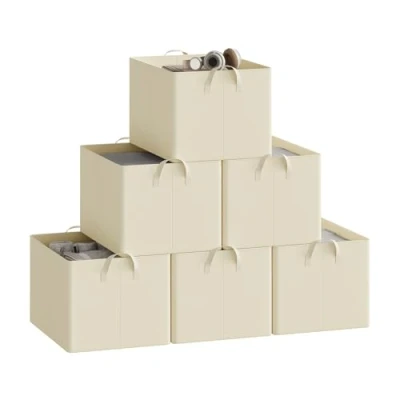 WOLTU Set of 6 Foldable Storage Boxes, Fabric Baskets with Handles, Wardrobe Organisers, Toy Boxes Clothes for Shelves, Cream, 47x35x29cm