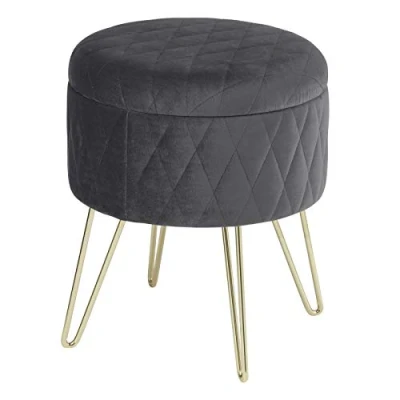 WOLTU Storage Ottoman Chair Stool Dark Grey Upholstered Footstool Velvet Dressing Table Pouf Couch Hairpin Golden Steel Legs Removable Cover, (DiaxH) 31.5x36cm