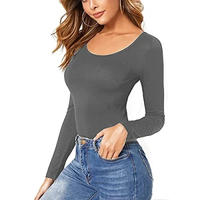 Women Ladies Long Sleeve Round Neck Plain Top Stretchy Casual T Shirts Basic Slim fit Tee Tops 8 10 Dark Grey