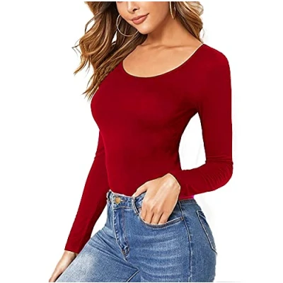 Women Ladies Long Sleeve Round Neck Plain Top Stretchy Casual T Shirts Basic Slim fit Tee Tops 8 10 Red