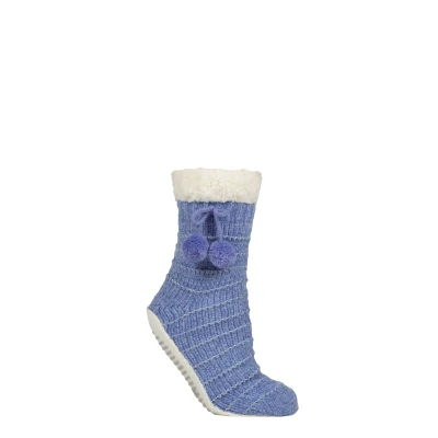 Relax in the velvety, fleecy luxury of these Elle Chenille Slipper Socks! Knitted into a horizontal rib pattern, with a sparkling glitter stripe woven into them, these chunky-feel slipper socks are very glam, and very cosy too, thanks to a thick sherpa fleece lining that spills out into a deep, fleece cuff top. Those tops are finished by a cute bow cord and pom pom detail. These sublimely soft Elle women’s slipper socks have flat, suede effect moccasin-style soles with a non-slip grip dot pattern tread for added safety from slips and slides on highly polished wood, tile and laminate floors. Tied with a satin ribbon, and with a ready-attached gift tag, these luxurious, lined women’s slipper socks would make a great gift idea.