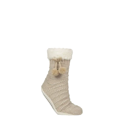 Relax in the velvety, fleecy luxury of these Elle Chenille Slipper Socks! Knitted into a horizontal rib pattern, with a sparkling glitter stripe woven into them, these chunky-feel slipper socks are very glam, and very cosy too, thanks to a thick sherpa fleece lining that spills out into a deep, fleece cuff top. Those tops are finished by a cute bow cord and pom pom detail. These sublimely soft Elle women’s slipper socks have flat, suede effect moccasin-style soles with a non-slip grip dot pattern tread for added safety from slips and slides on highly polished wood, tile and laminate floors. Tied with a satin ribbon, and with a ready-attached gift tag, these luxurious, lined women’s slipper socks would make a great gift idea.