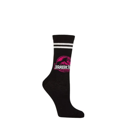 Want to rock Jurassic Park socks? SOCKSHOP uh, finds a way… with our great SOCKSHOP Jurassic Park Cotton Socks! These crew length women’s socks come in black and feature the iconic movie franchise logo that will make them a must-have for dino lovers! Knitted in a soft, breathable fine gauge cotton rich blend, these Jurassic Park socks are predominantly black, with a pink and white motif on the legs. For extra style points, they also have a twin, white sports stripe detail at the cuffs.