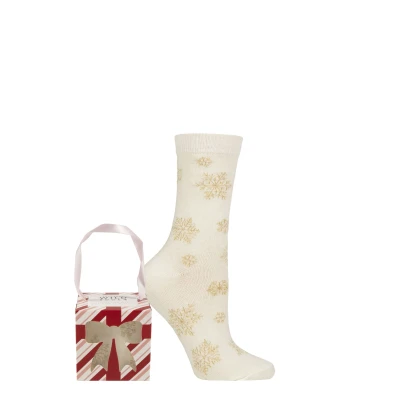 Women's 1 Pair SOCKSHOP Wildfeet Christmas Gift Box Socks Snow Flakes Gold 4 8