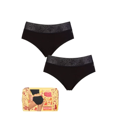 More convenient and comfy than using disposable sanitary products, choosing superb leakproof underwear like Sloggi Period Pants takes the worry away from your day — that they’re so soft and pretty too is almost a bonus! Simply on a pair of these attractive, stretch lace-topped modal panties and there’s no need for changing pads or tampons for up to eight hours! They’re reusable with a rinse and wash, and better for the environment too. These Sloggi Hipster Medium Period Pants are designed for days when you’re experiencing a medium/moderate flow (when you’d otherwise use up to three tampons during your day). The design of these hipster-style panties incorporates an extra-long, ultra-thin gusset that protects with four absorbent, moisture-locking and leakproof layers, and also gives you extra confidence with anti-bacterial and odour-resisting Silvadur 930 technology. And because they’re all you need, they don’t have that ‘bulky’ feeling. Better yet, flat seams mean no VPL under clothes. These twin packs of Sloggi Period Pants come packed with a reusable zip-up toiletry bag that’s been covered in exclusive cartoons with a period theme.