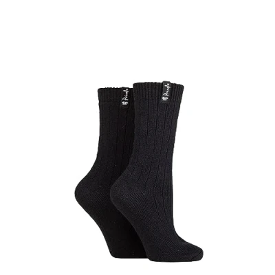 Knitted in a heavy ribbed pattern, these two pairs of women's’ Pringle Classic Boot Socks are pleasingly weighty, and traditional in looks. Both pairs in this twin pack are made in a blend of natural wool and viscose, with other synthetic fibres strategically added to provide an ideal combination of durability, warmth and breathability. For their suggested use as walking socks, Pringle has included reinforcement at the toes and heels to give increased wear resistance.These Pringle wool blend boot bocks are a crew leg length, with a woven Pringle brand tab wrapped over the cuff of one sock in each pair.