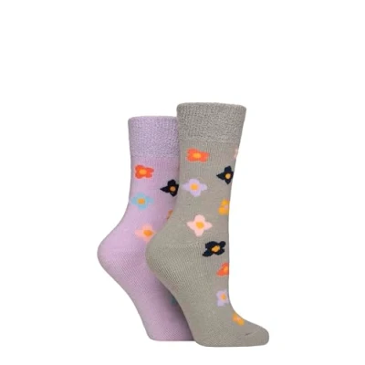 Women's 2 Pair SOCKSHOP Wildfeet Thermal Socks Grey / Purple Floral 4 8