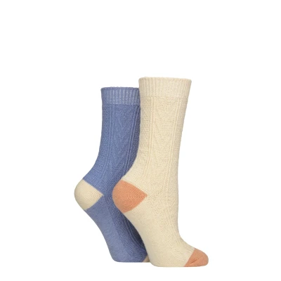Classic style women’s wooly boot socks to keep your feet warm and cosy in colder weather! Our SOCKSHOP Wool Mix Boot Socks are satisfyingly thick, knitted in a medium gauge with an attractively textured, traditional cable rib pattern. Available as as twin pack of mixed colour pairs, the socks have contrast colour detail toes and heels. These crew length socks are suitable for all ankle length women’s boots, walking boots or country leisure footwear. The wool blend allows these socks to be naturally breathable, with good air circulation so your feet remain fresh, dry and comfortable, while still staying warm.