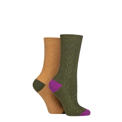 Classic style women’s wooly boot socks to keep your feet warm and cosy in colder weather! Our SOCKSHOP Wool Mix Boot Socks are satisfyingly thick, knitted in a medium gauge with an attractively textured, traditional cable rib pattern. Available as as twin pack of mixed colour pairs, the socks have contrast colour detail toes and heels. These crew length socks are suitable for all ankle length women’s boots, walking boots or country leisure footwear. The wool blend allows these socks to be naturally breathable, with good air circulation so your feet remain fresh, dry and comfortable, while still staying warm.