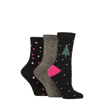 Women's 3 Pair Caroline Gardner Christmas Patterned Cotton Socks Black Tree/ Glitter / Spot 4 8