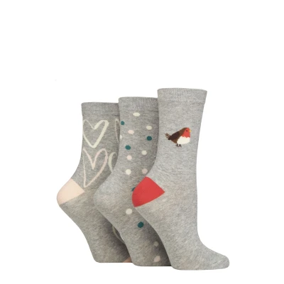 Women's 3 Pair Caroline Gardner Christmas Patterned Cotton Socks Robin 4 8