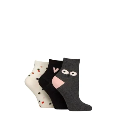 Women's 3 Pair Caroline Gardner Cotton Patterned Mid Length Crew Socks Owl / Heart Spots 4 8