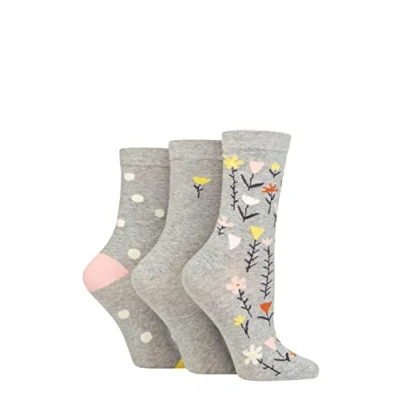 Women's 3 Pair Caroline Gardner Patterned Cotton Socks Floral Light Grey UK 4 8