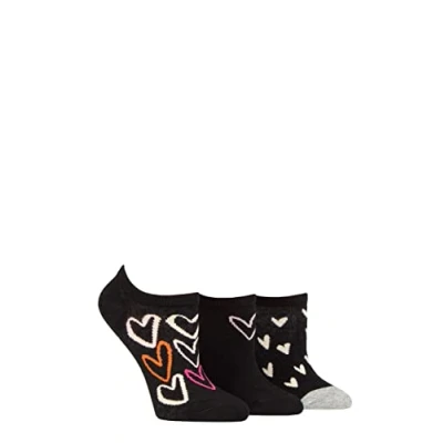 Women's 3 Pair Caroline Gardner Patterned Cotton Trainer Socks All Over Hearts Black UK 4 8