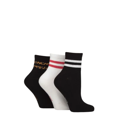 Women's 3 Pair Elle Half Cushion Bamboo Sport Anklet Socks Leopard Noir Stripe 4 8