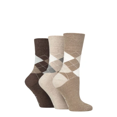 Women's 3 Pair Gentle Grip Argyle Patterned Cotton Socks Brown / Neutral 4 8 Ladies