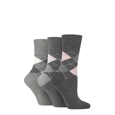 Women's 3 Pair Gentle Grip Argyle Patterned Cotton Socks Charcoal / Grey 4 8 Ladies
