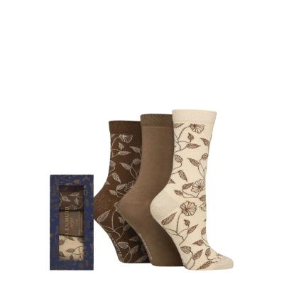 Women's 3 Pair Glenmuir Bamboo Patterned Socks in Christmas Gift Box Beige / Brown Floral 4 8
