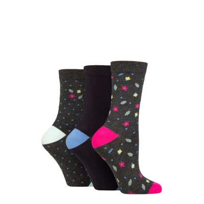 Women's 3 Pair Glenmuir Patterned Bamboo Socks Flowers Charcoal 4 8 Ladies