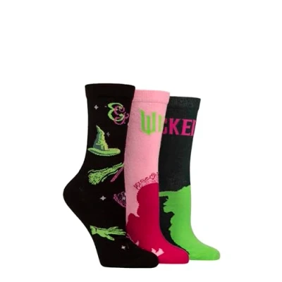 Proving beyond a shadow of a doubt that ‘Pink goes good with Green’, the enchanting designs in our triple pair pack of SOCKSHOP Wicked the Musical Socks are certain to conjure up a fresh dose of the feels every time you wear them! These cotton rich women’s socks are smooth, soft and comfortable in a fine gauge knit and a crew length. A natural fibre, cotton is moisture absorbing, cool and breathable to wear. Whether you're defiantly Team Elphaba, or if Team Glinda is more ‘Popular’ with you, this set of Wicked socks, inspired by the perfectly imperfect blend of the show’s two lead witches, gives you both options, to mix, match or even share if you like! They’ll have you ‘Dancing Through Life’ day after day!