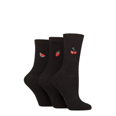 Women's 3 Pair SOCKSHOP Wildfeet Bamboo Embroidered Crew Socks Fruits 4 8