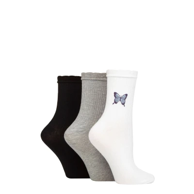 Women's 3 Pair SOCKSHOP Wildfeet Mid Length Frill Top Embroidered Socks Butterfly 4 8