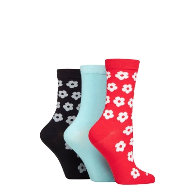 Women's 3 Pair SOCKSHOP Wildfeet Patterned Bamboo Socks Flowers Red / Blue Navy 4 8