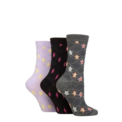Women's 3 Pair SOCKSHOP Wildfeet Textured Knit Cotton Socks Stars / Lightning Bolt 4 8