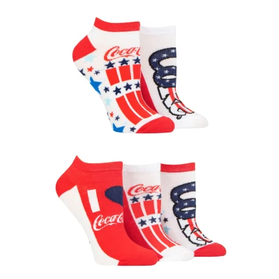 Made for enjoying with lightweight shoes and trainers, and (of course) with an ice cold Coke to cool you down, these women's’ Coca Cola Stars and Stripe Shoe Liner Socks make perfect partners for all your casual summer wardrobe choices.Soft-knitted, smooth and breathable, decorated with exciting, star-spangled USA-themed designs in red, white and blue, celebrating the world famous beverage, these five pairs of Coca Cola women's’ ankle socks are lightweight, soft and non-cushioned for a cool, comfortable and fresh feel.