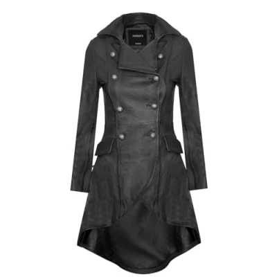 AmazonGothic-inspired leather coat fuses tailored trench with unique stylishness High-quality leather ensures style and durability in this trench coat Double-breasted closure adds classic, timeless charm to this stylish coat The jacket's dramatic tail coat hem infuses a feminine touch, creating a distinctive silhouette reminiscent of Edwardian and Victorian fashion 100% leather constructs this luxurious coat for style enthusiasts' delight