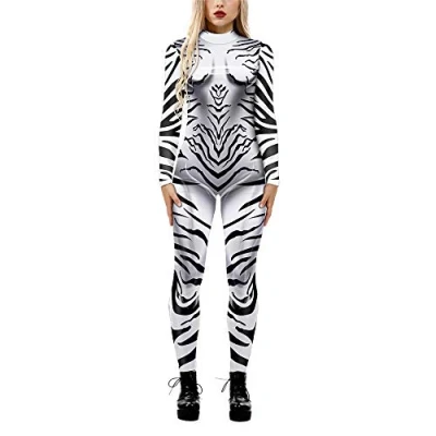 Women?s Halloween Funny Animal Texture Catsuit Outfits, Surwin Ladies 3D Printed Long Sleeve Skinny Stretch Fancy Dress Up Cosplay Adults Jumpsuit Bodysuit (White tiger,S)