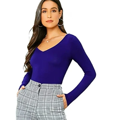 Women's Ladies Long Sleeve V Neck Basic Top Jersey Plain Stretchy Slim Fit Casual Wear T Shirt Tee Tops 12 14 Royal Blue