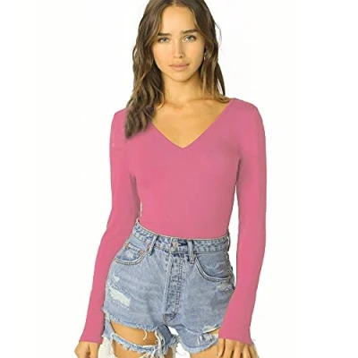 Women's Ladies Long Sleeve V Neck Basic Top Jersey Plain Stretchy Slim Fit Casual Wear T Shirt Tee Tops 16 18 Coral